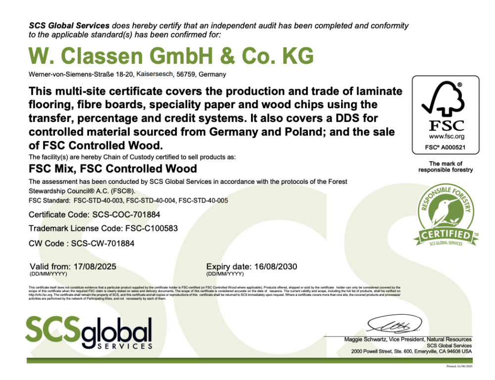 подтверждается, что ламинат Classen соответствует строгим критериям по качеству воздуха в помещении и уровню эмиссии (выделения веществ)
