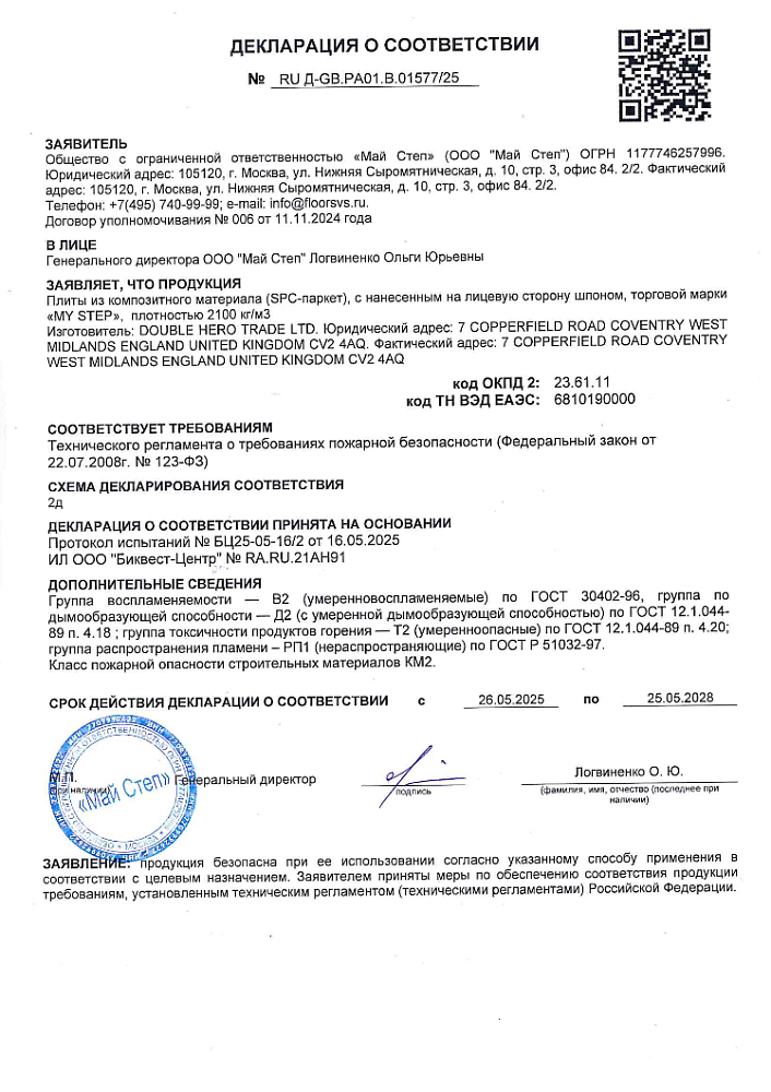 Дата получения: 26.05.2025 декларация о соответсвии SPC паркет пожарной безопасности